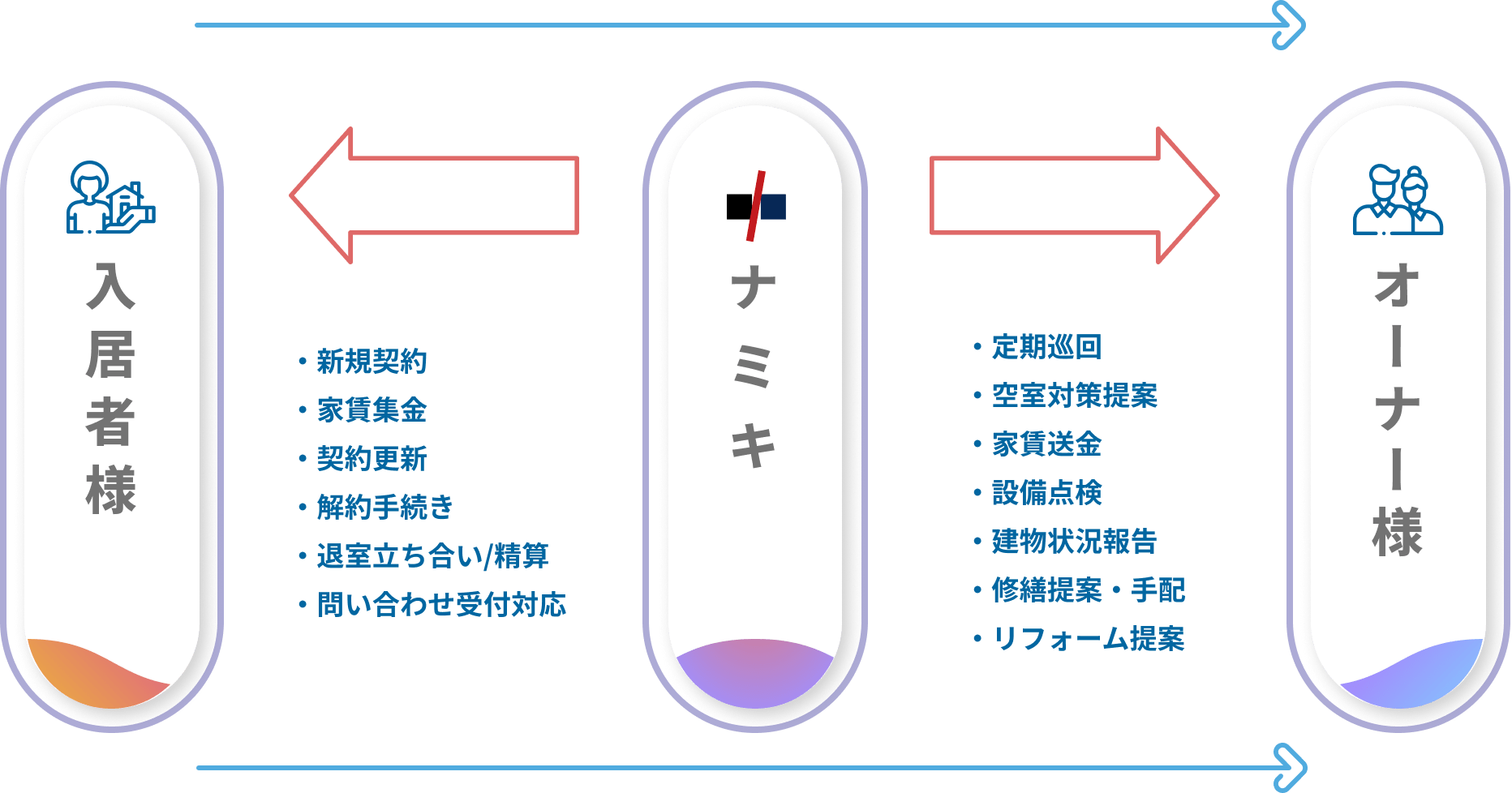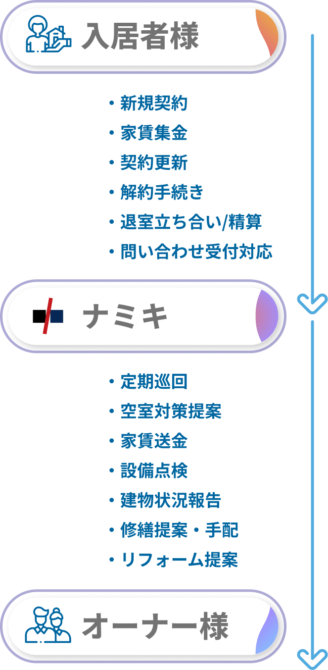入居者様の募集から、毎月の家賃管理、契約更新・解約手続き、建物の巡回・清掃、修繕の手配、消防設備点検など、オーナー様の賃貸経営を全面的にサポートいたします。