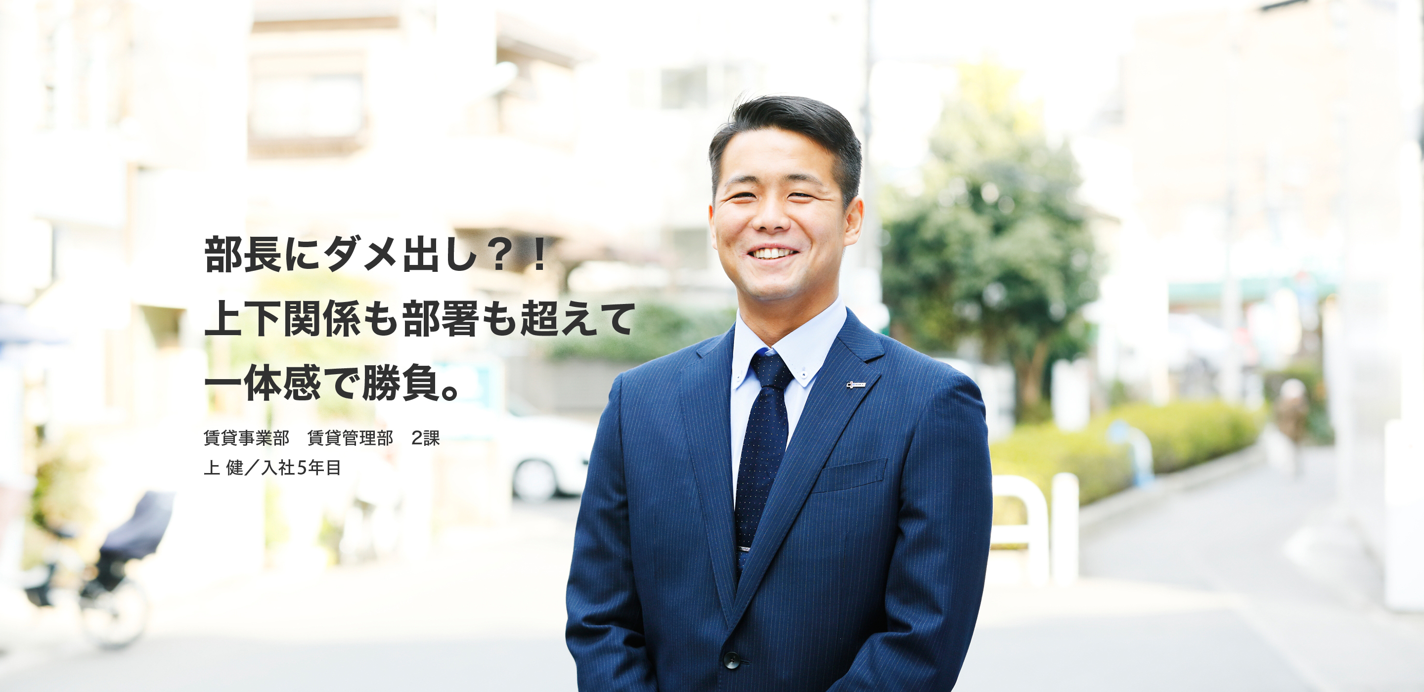 名字の「上」は「ウエ」ではなく「カミ」と呼びます。ですから、取引先からは「カミサマ」「カミサン」と呼ばれています(笑)。所属は賃貸管理部で、オーナー様と入居者様との間に立って退去時の原状回復の費用負担割合を調整したり、家賃滞納の督促、そしてリノベーションも提案します。大規模な修繕では数百万円単位のお金が動くことになり、大きな受注に繋がることも。オーナー様からの信頼をベースに、世の中の住まいの嗜好変化にも対応し、物件の価値を磨いていくやりがいがあります。ちょっと大袈裟かもしれませんが、街の活性化にも繋がる仕事だと思いますよ。